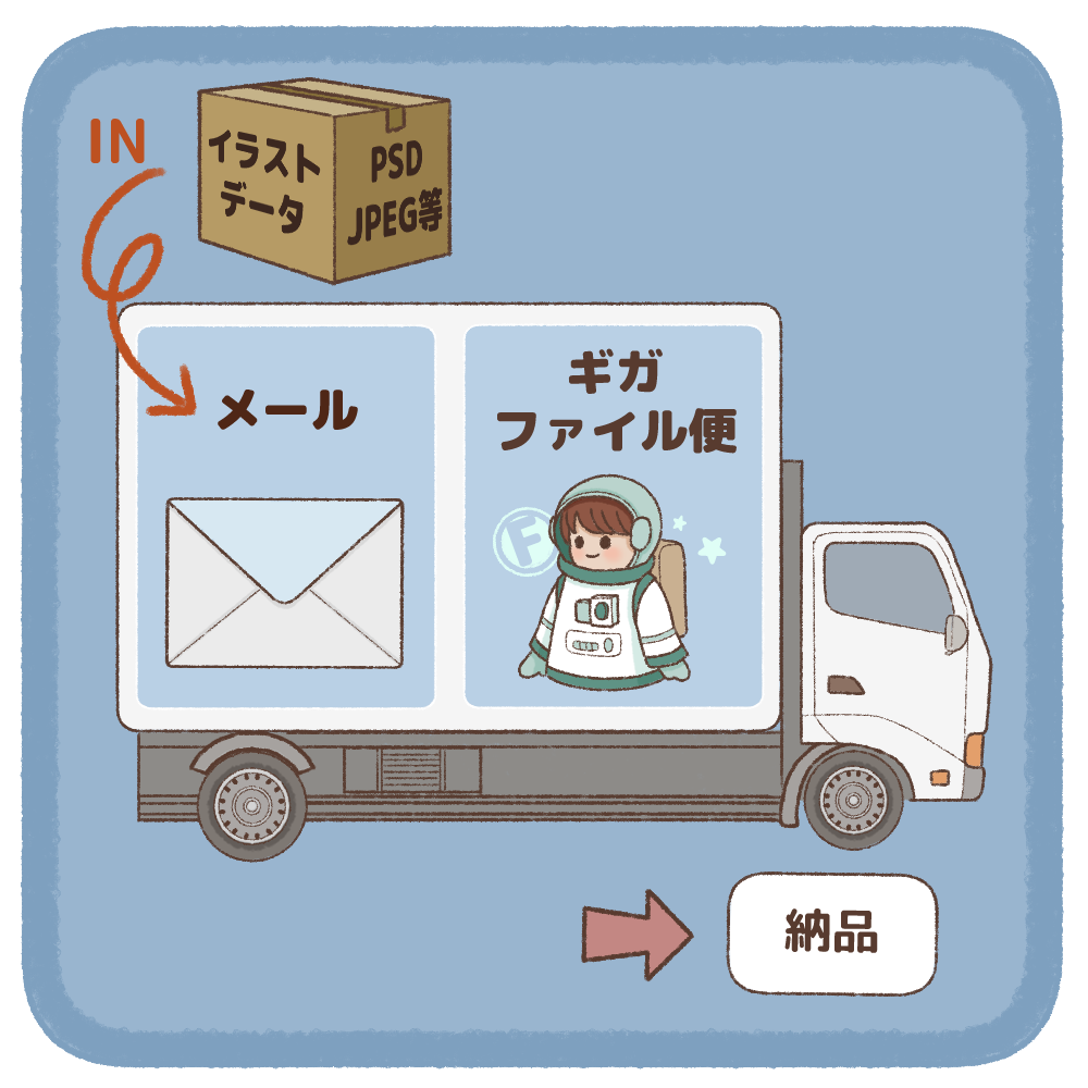 完成したデータは、メール添付またはギガファイル便にて納品いたします。他にご希望の方法がありましたら、ご相談ください。