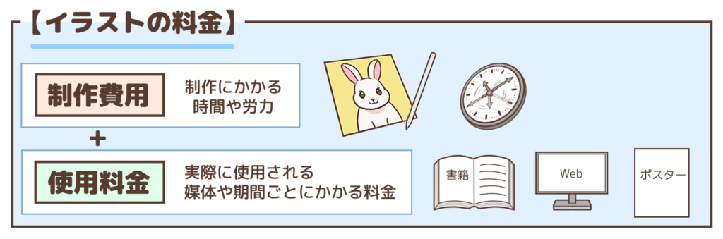 イラストの料金とは前提として、イラストレーターにイラストを発注し、それを使用するためには、制作費と使用料がかかります。